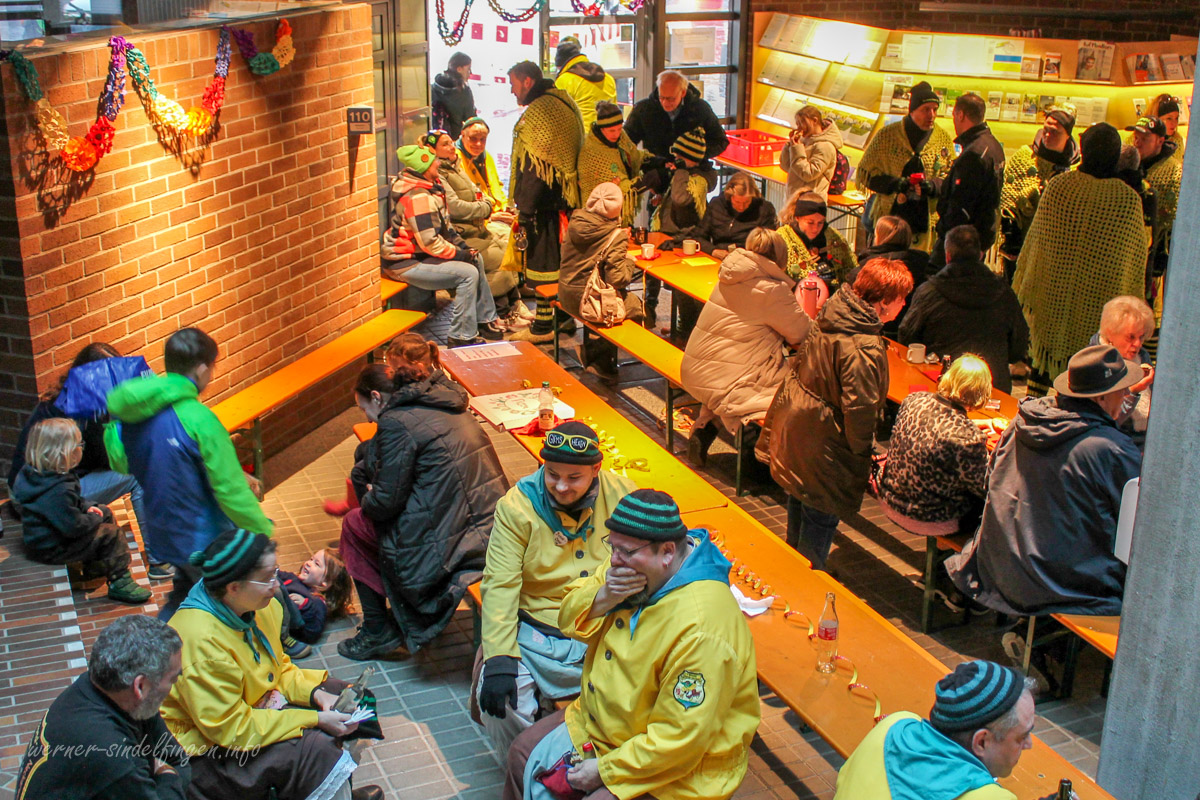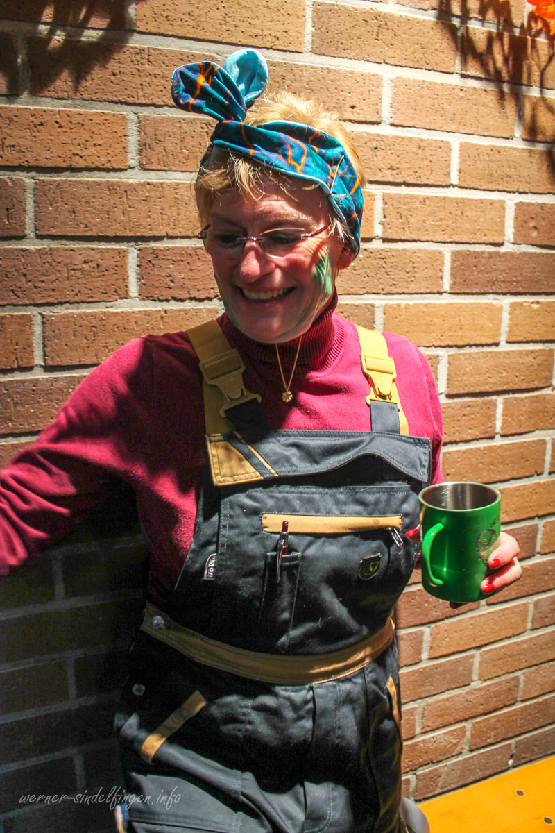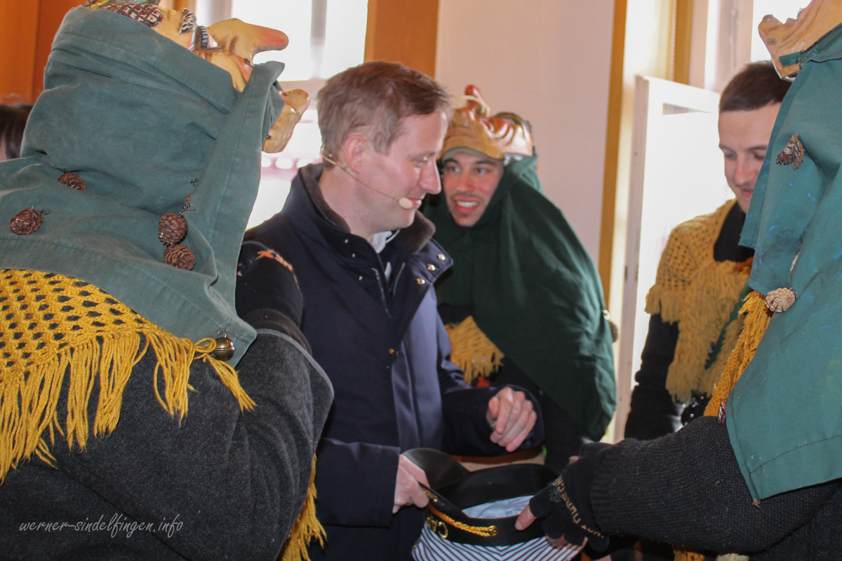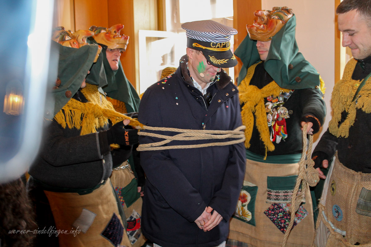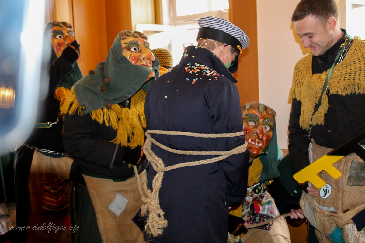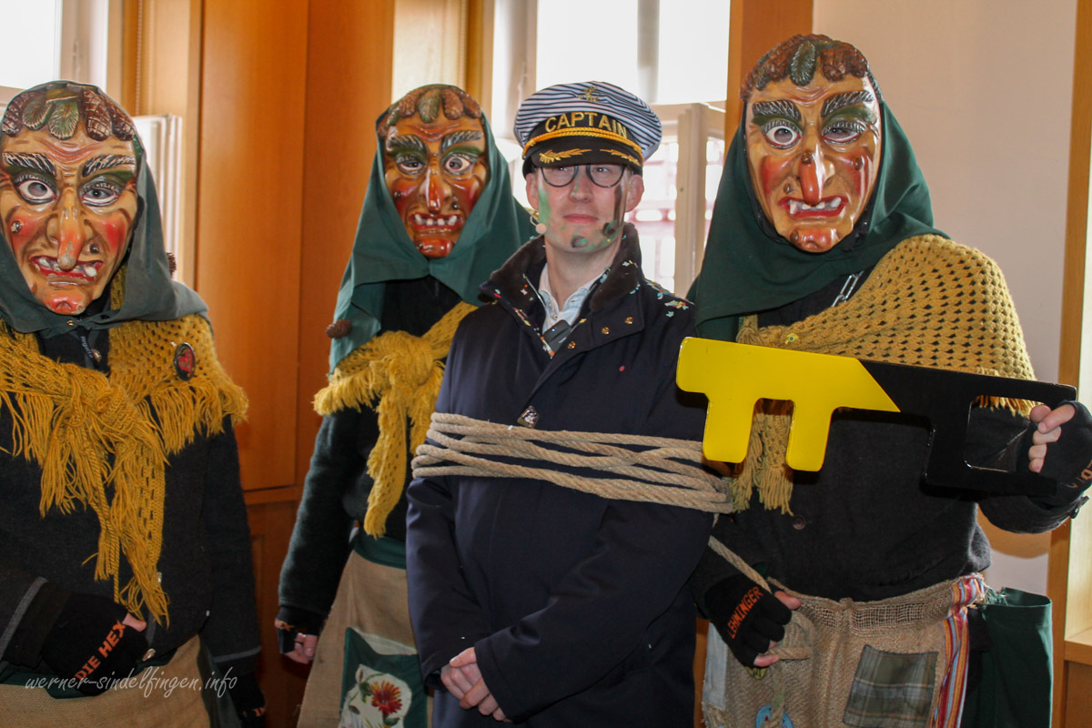 Mit lautem Hexenruf rückten die Hästrägerinnen und Hästräger um Bürgermeisterin Susanne Widmaier sowie den Ersten Beigeordneten Martin Killinger aus ihren Amtsstuben zu jagen. Ganz kampflos geschah das allerdings nicht. Die vor der Rathaustür in „Schaffer-Uniform“ postierte Verwaltungsmannschaft verteidigte ihre Chefin und ihren Chef nach Kräften, letztlich jedoch ohne Erfolg.