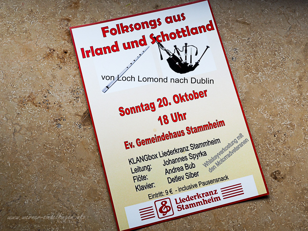 Über 120 Personen konnten am 20. Oktober 2019 eine musikalische Reise von den Highlands nach Dublin im vollbesetzten, evangelischen Gemeindehaus in Stammheim miterleben. Der Liederkranz Calw-Stammheim, genauer gesagt der Chor KLANGbox mit über 10 aktiven Mitglieder, gab da dieses Konzert.
