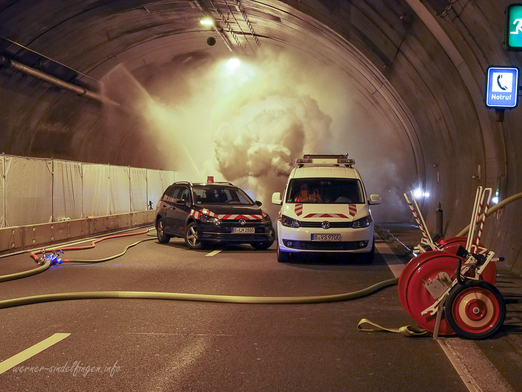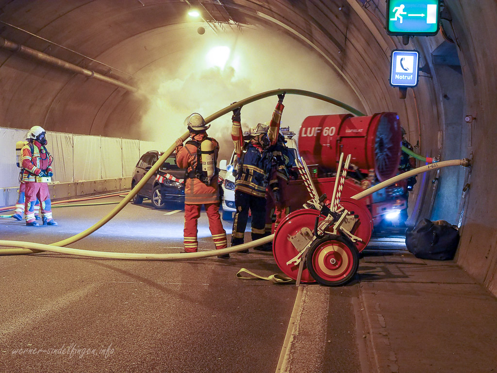 Solche Übungen müssen in regelmäßigen Abständen durchgeführt werden. Die Einsatzkräfte können so relativ realitätsnah alle Abläufe proben. Die wichtigsten Maßnahmen sind bei einem Unfall und Brand im Tunnel die Kühlung der Tunnelstruktur um weitere Schäden und ein teilweises Einstürzen zu verhindern. Auch die Bergung der Personen und Untersuchung aller Fahrzeuge nach Personen gehört zum Pflichtprogramm. Je nach Größe kann natürlich auch die Löschung der Brände Probleme machen und es wird Spezialgerät benötigt. Hier kam bei der Löschung des Brandes zudem ein LUF (Lösch-Unterstützungs-Fahrzeug LUF 60) zum Einsatz. Dies ist ein ferngesteuertes Fahrzeug auf Ketten was genau durch die Querverbindungen zwischen den Tunnelröhren fahren kann. Das sind aber bei weitem nicht alle Aufgaben die die Rettungskräfte im und am Tunnel haben.