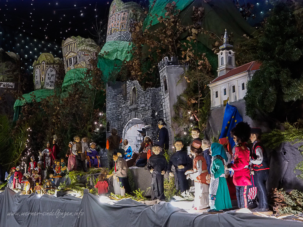 Z.B. auch Puppen von Hildegard Buchhalter mit den traditionellen Figuren aus aller Welt. Weiter sind die Motive wie gewohnt im ganzen Kirchenschiff verteilt.